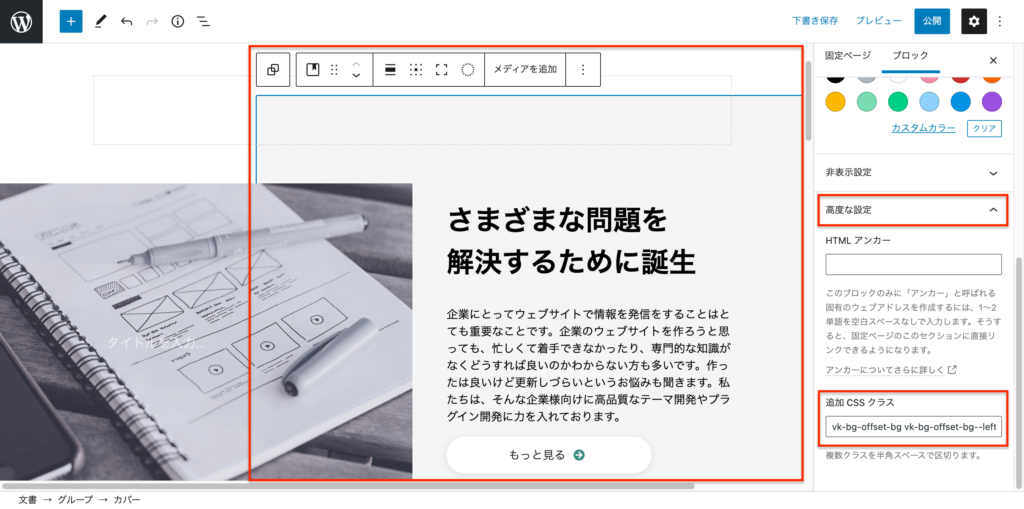 選択した状態で、ブロックメニューの「高度な設定」をクリックし、「追加 CSS クラス」を確認します。ここにはすでにオフセット背景用のクラス名が入っています。このクラス名を他の既存のクラス名に変更していきます。